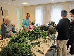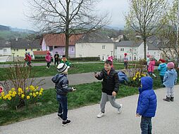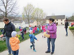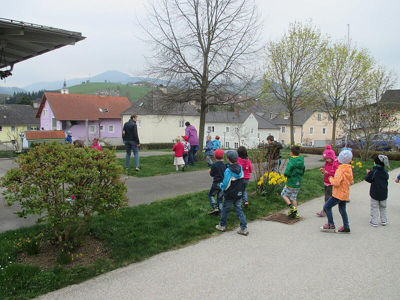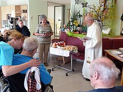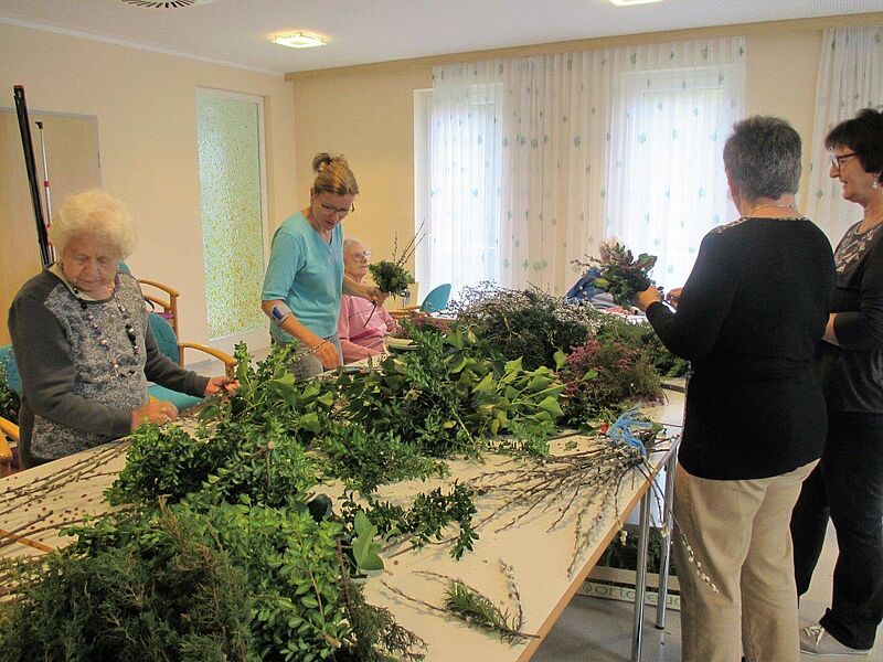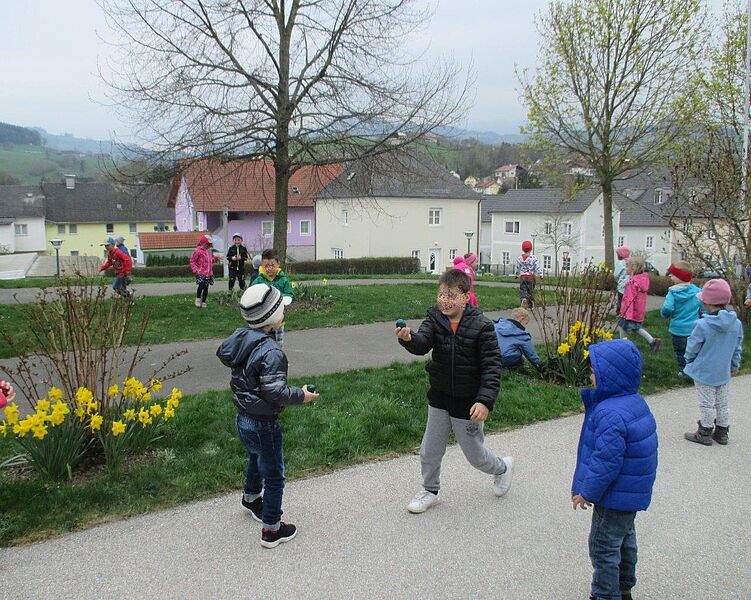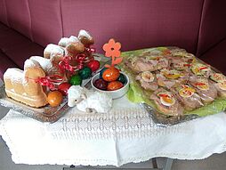Die Kinder des Kindergarten Grünburgs sind eingeladen worden, versteckte Ostereier im Garten vorm Altenheim zu suchen. Sie waren sichtlich begeistert, dass sie so viele bunte Eier gefunden haben. Mit Vorfreude spazierten sie zum Kindergarten zurück, um dort mit den gefundenen Stücken „Eier zu pecken“. Fleißig haben die Bewohner und ehrenamtliche Helferinnen im Altenheim für den Palmsonntag Palmbesen gebunden, die anschließend im Gottesdienst geweiht wurden. Am Ostermontag wurden nach dem Festgottesdienst in allen Wohnbereichen Speisen geweiht, die dann zum Abendessen von den Bewohnern verzehrt wurden.